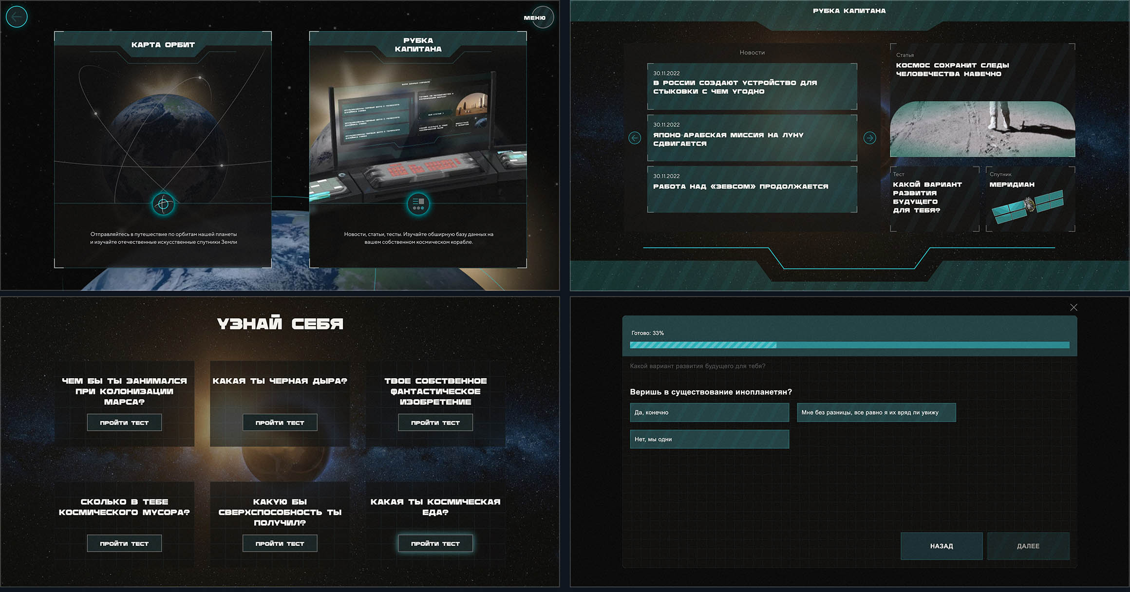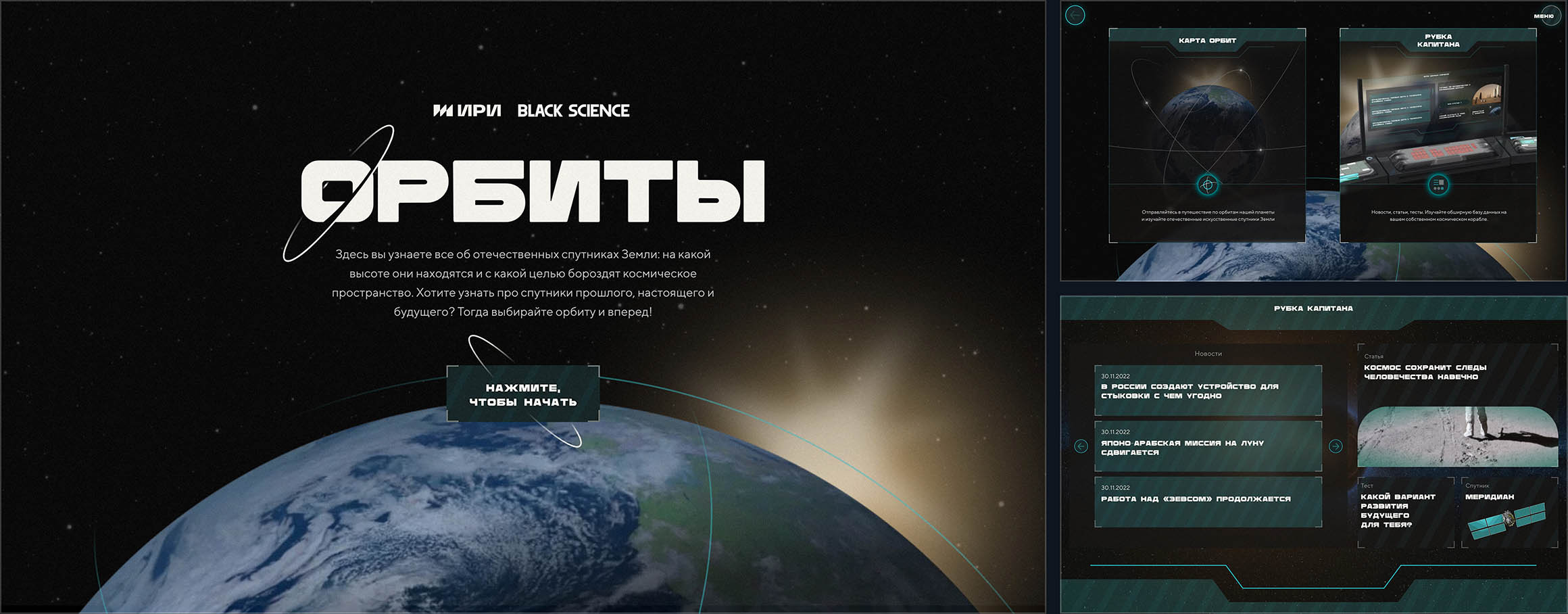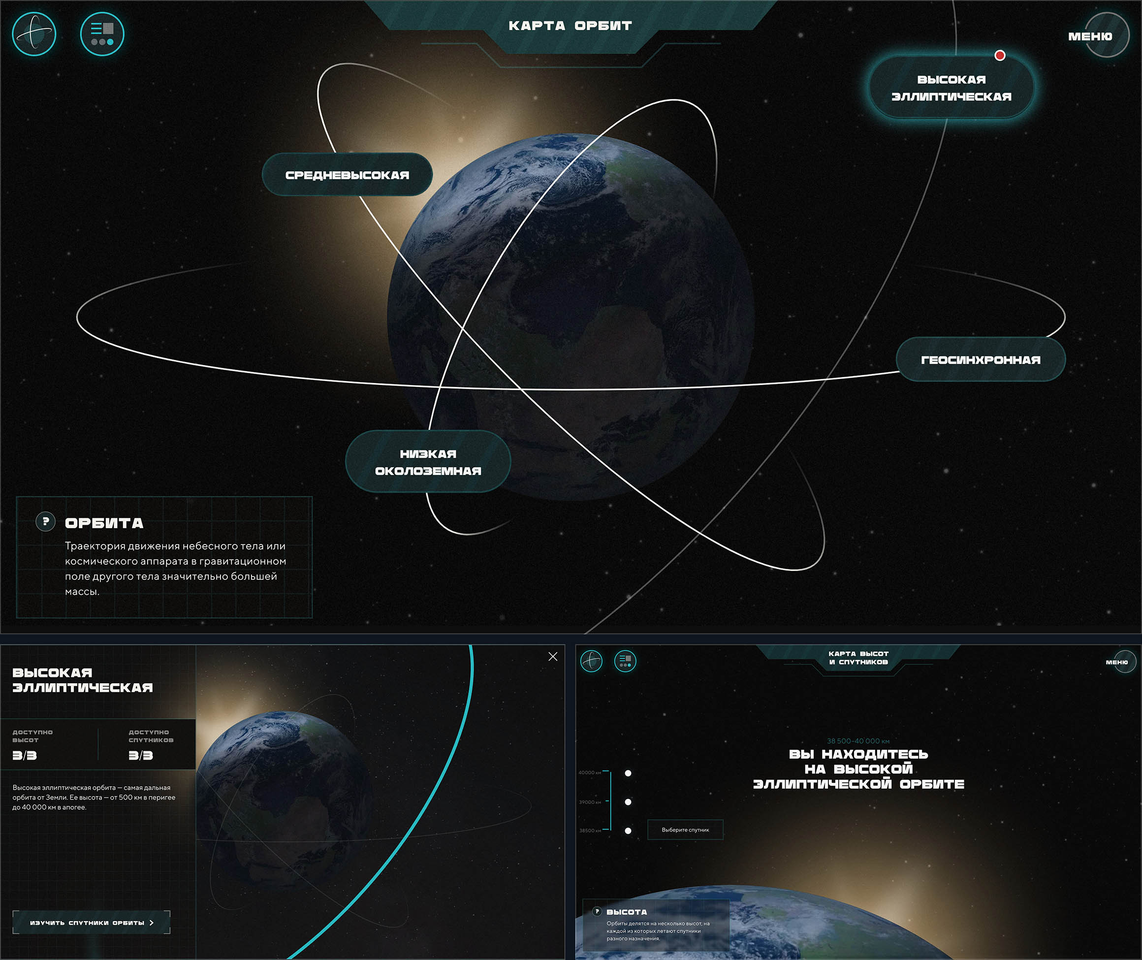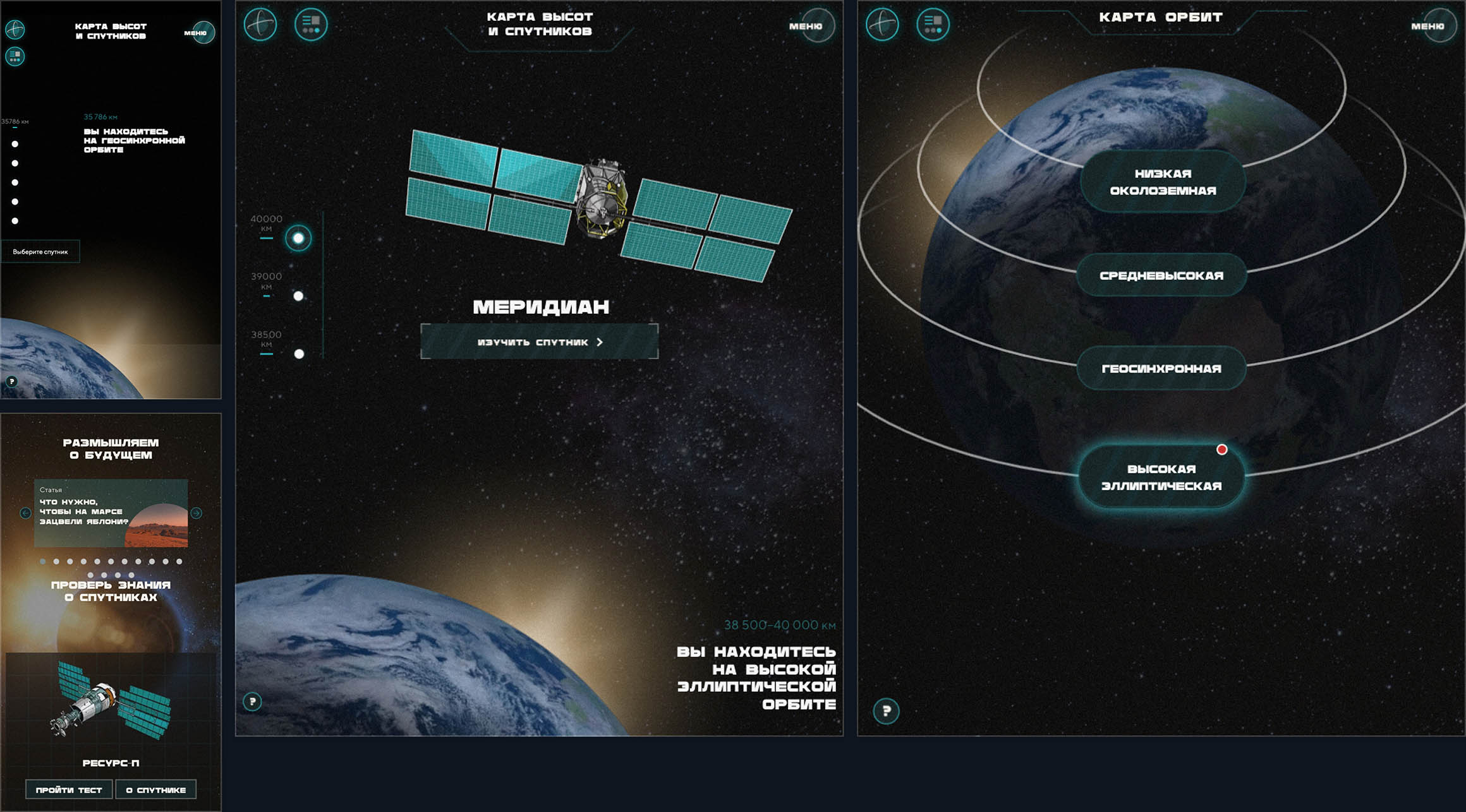 Navigation is built as a space journey: users choose an orbit, explore satellites on it, and open additional materials inside the “captain’s cabin.”