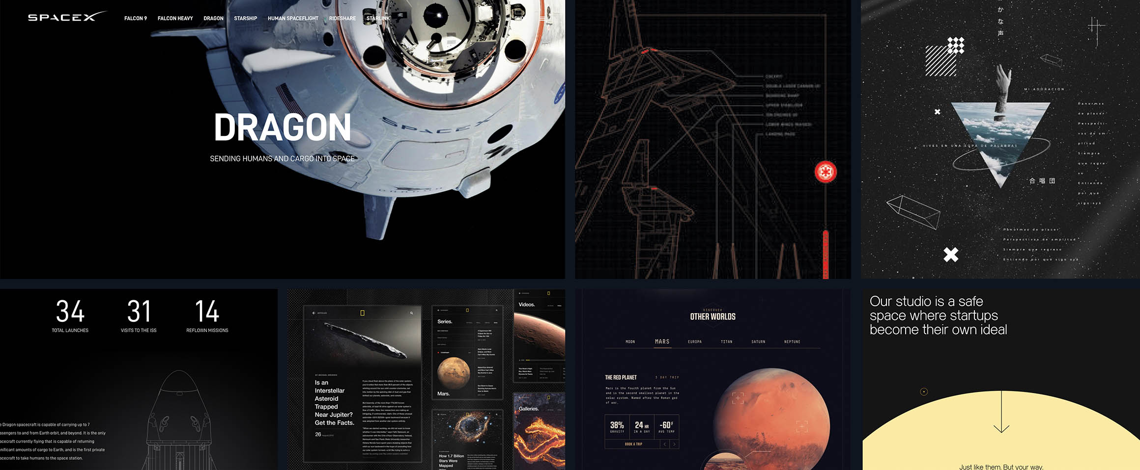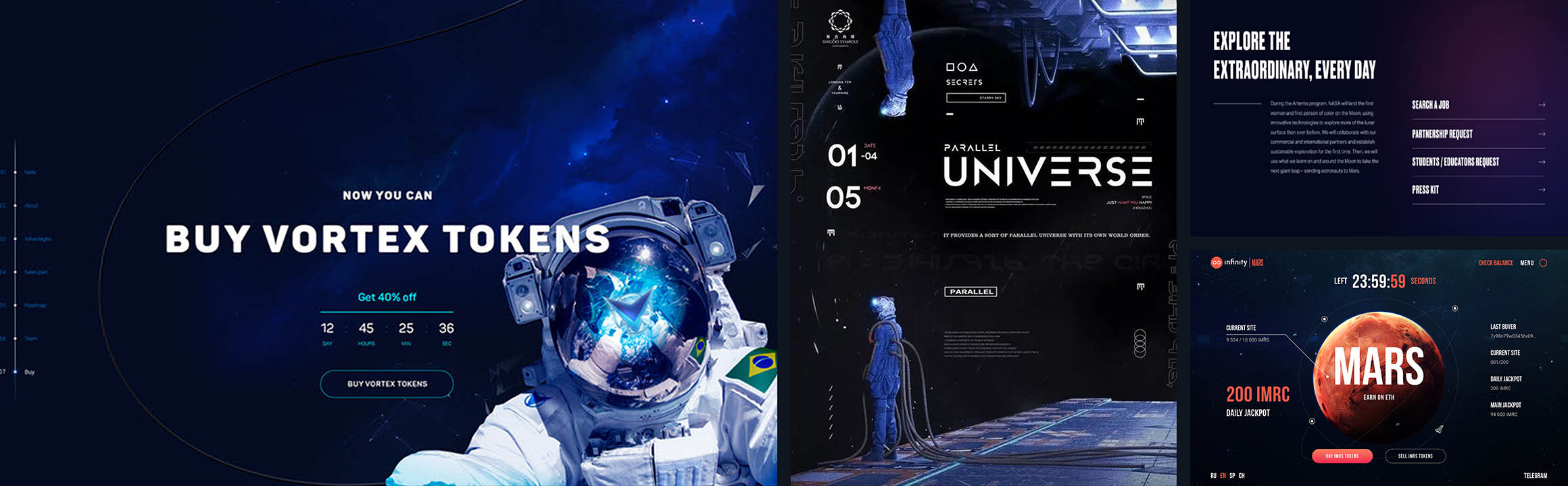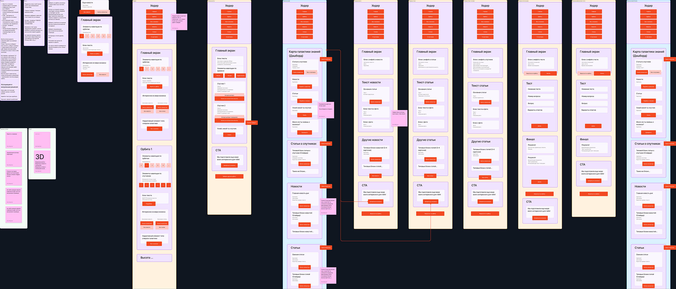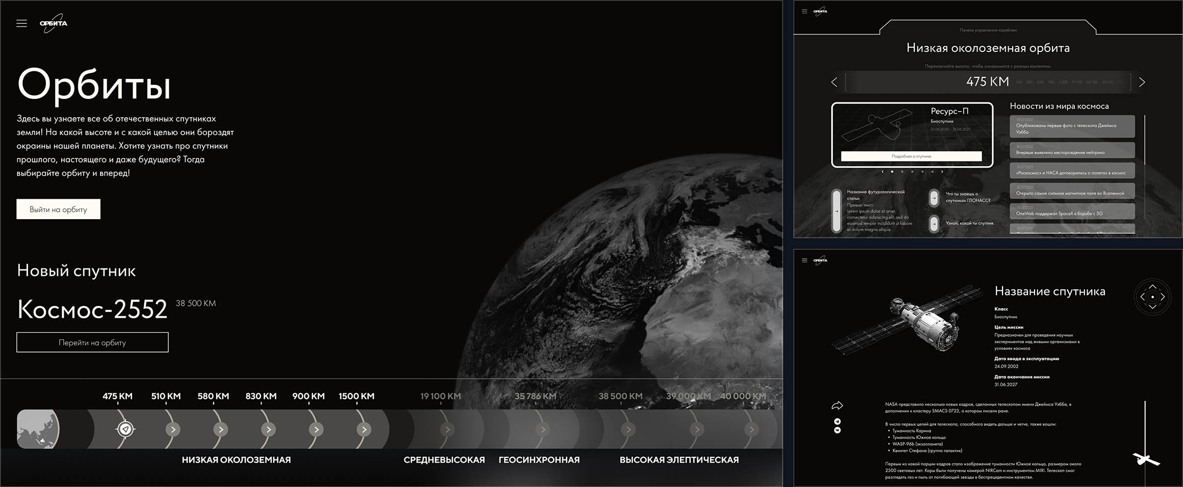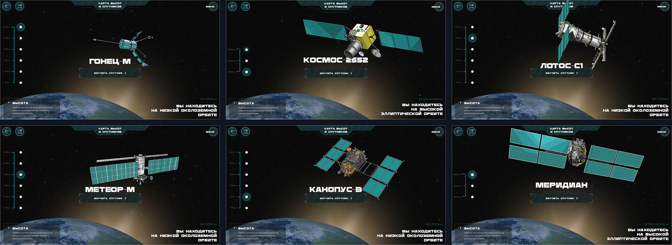 Navigation is built as a space journey: users choose an orbit, explore satellites on it, and open additional materials inside the “captain’s cabin.”
